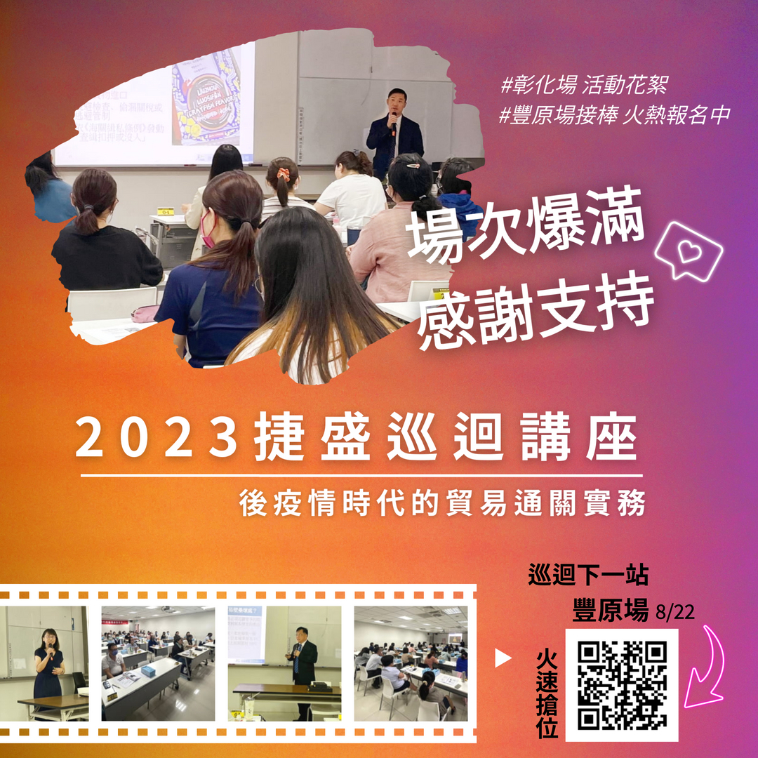 為回饋廣大進出口廠商的支持與愛護,捷盛報關特舉辦一系列精采的國際貿易與進出口通關實務專業巡迴講座,歡迎廠商踴躍報名參加。您可掃描附圖的QR code直接填表報名或撥打 ☎️免付費客服專線:0800-060-443 捷盛報關將由專人為您服務,業務負責人:彭喜珊