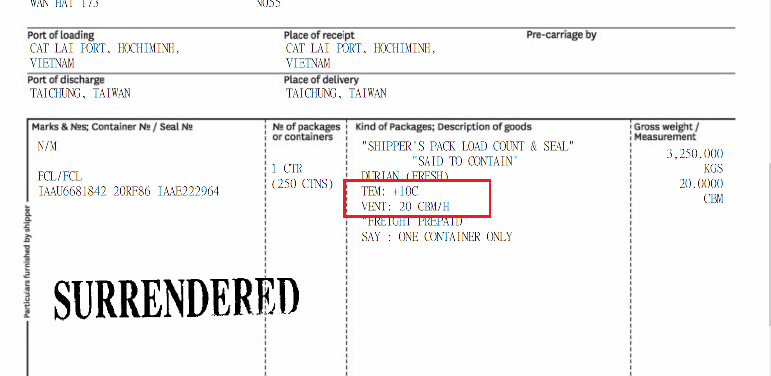 - 溫度與通風量的設定由託運人提供船公司,由船公司櫃場人員進行設定,自貨櫃預冷開始直到貨櫃抵達卸貨港全程都會有溫度與通風量的紀錄。