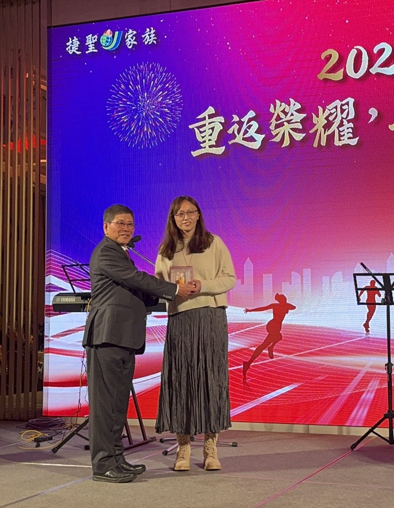 於歲末年終,公司為犒賞同仁們一年來的辛勤工作,舉辦了盛大的年終尾牙饗宴,除豐盛的美食外更準備了豐富的獎項提供同仁們摸彩同樂。 在尾牙宴開始前,捷聯公司Vivian從總經理手中接過了25年資深績優同仁的貢獻獎,表達公司對其最由衷的感謝。