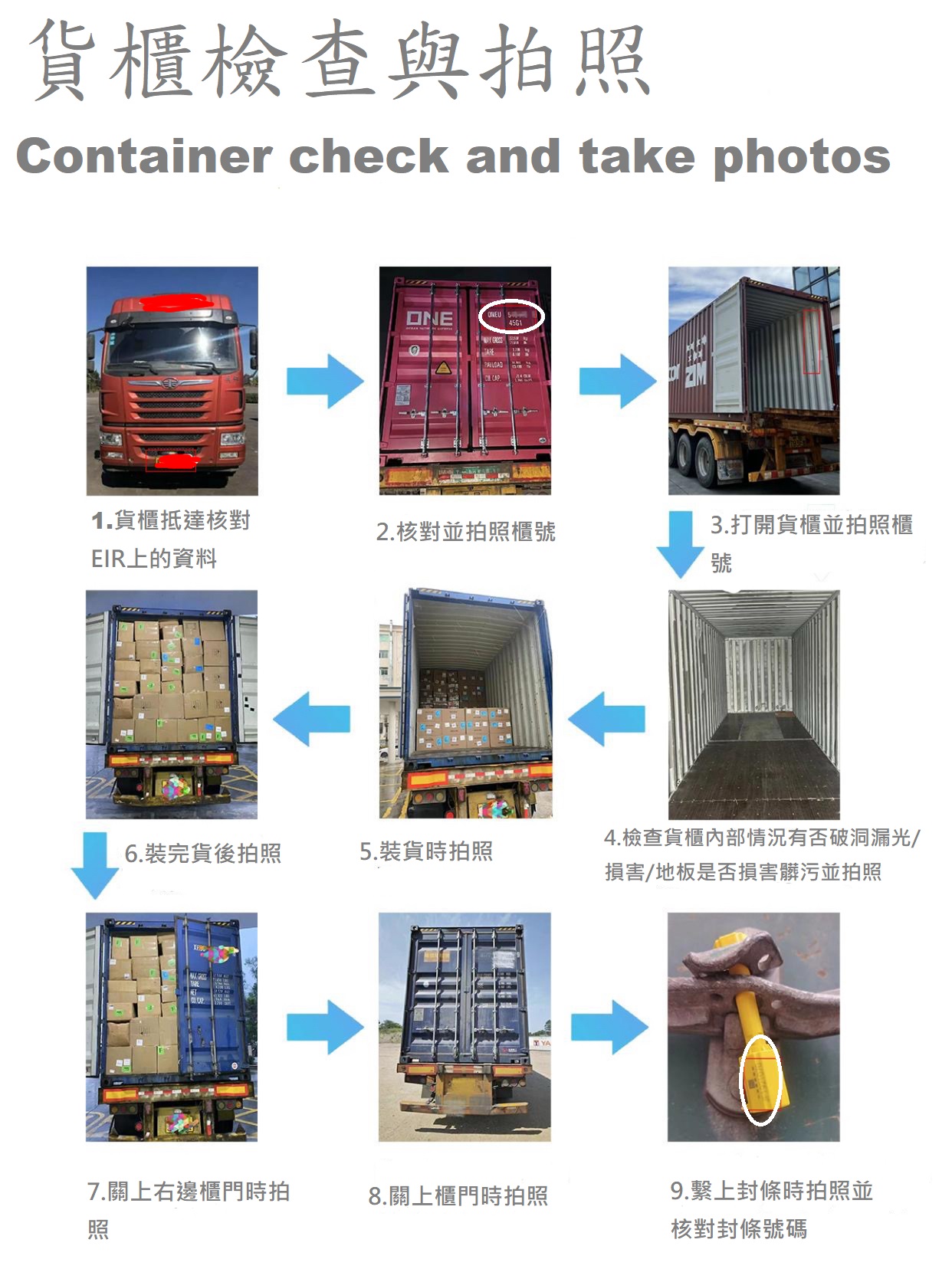 為釐清裝載貨物的貨櫃抵達目的地後發生貨櫃損壞髒汙的責任歸屬,強烈建議出口商在裝櫃時依照下列流程進行貨櫃的檢查與拍照,避免不必要的費用產生。